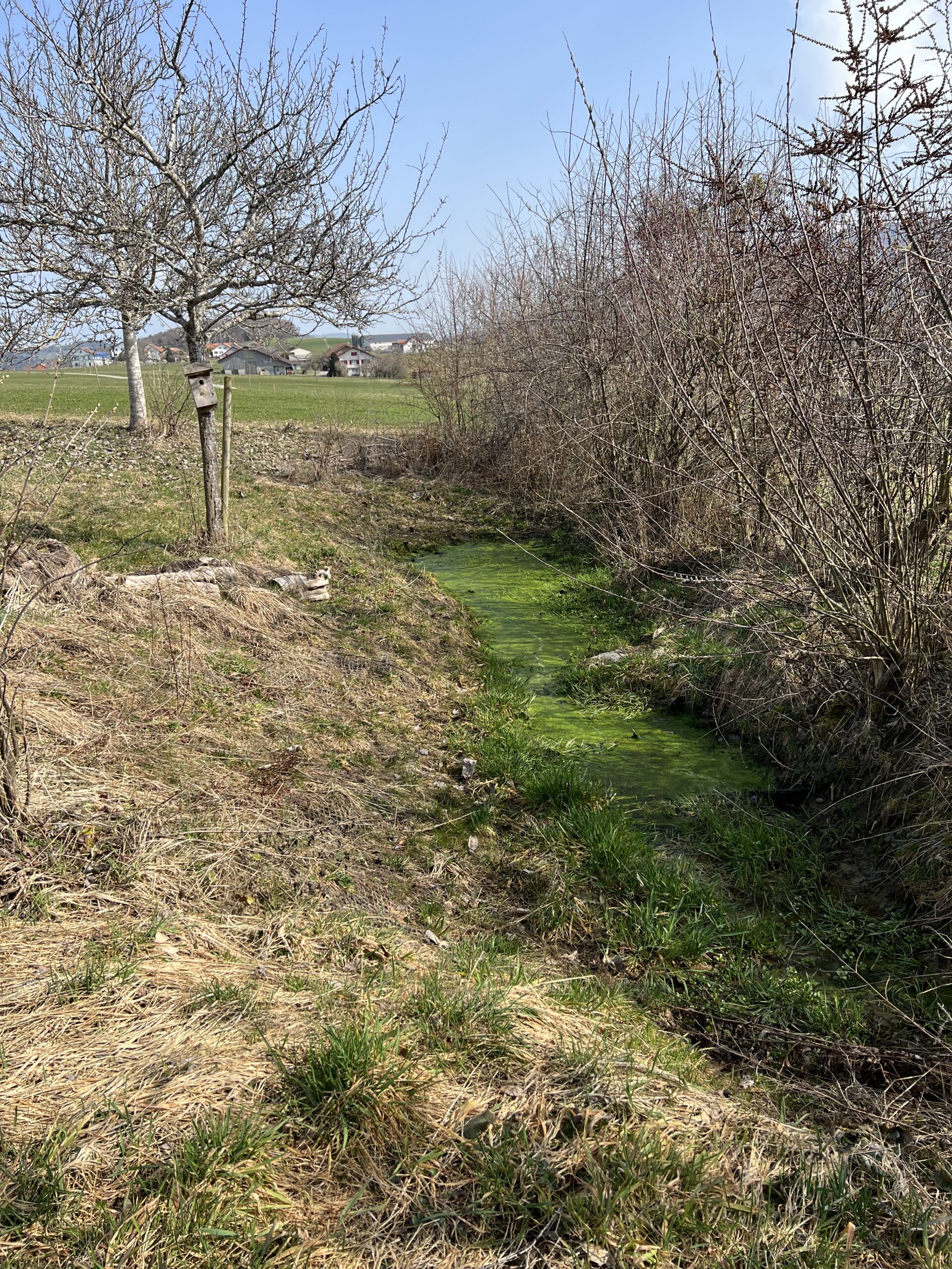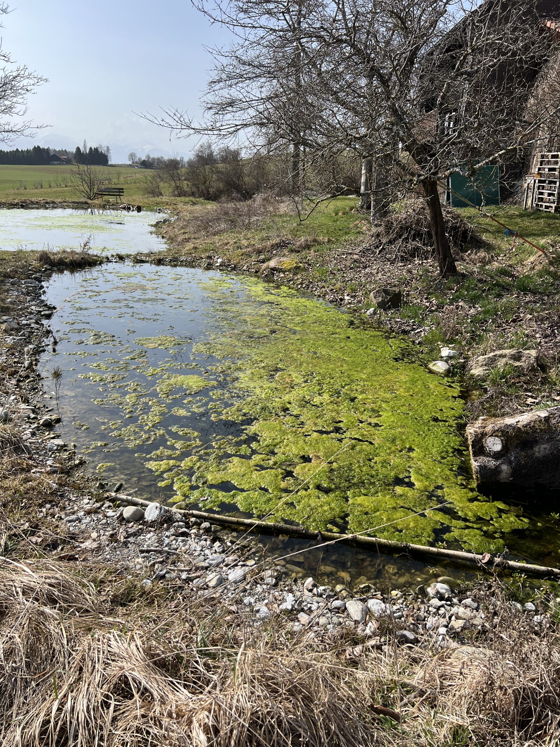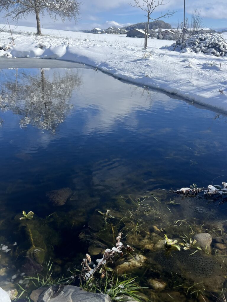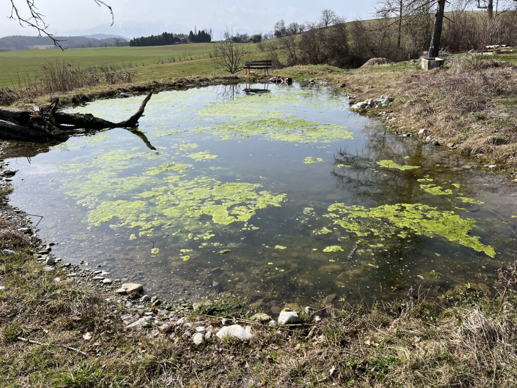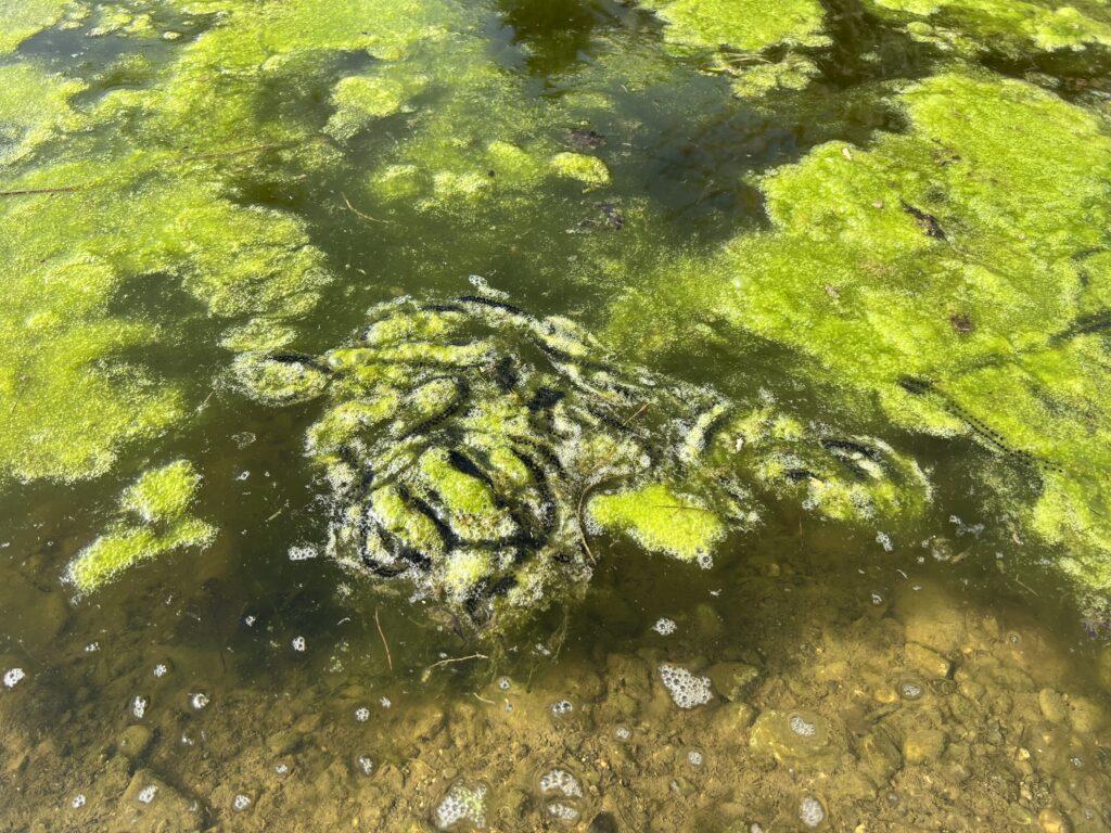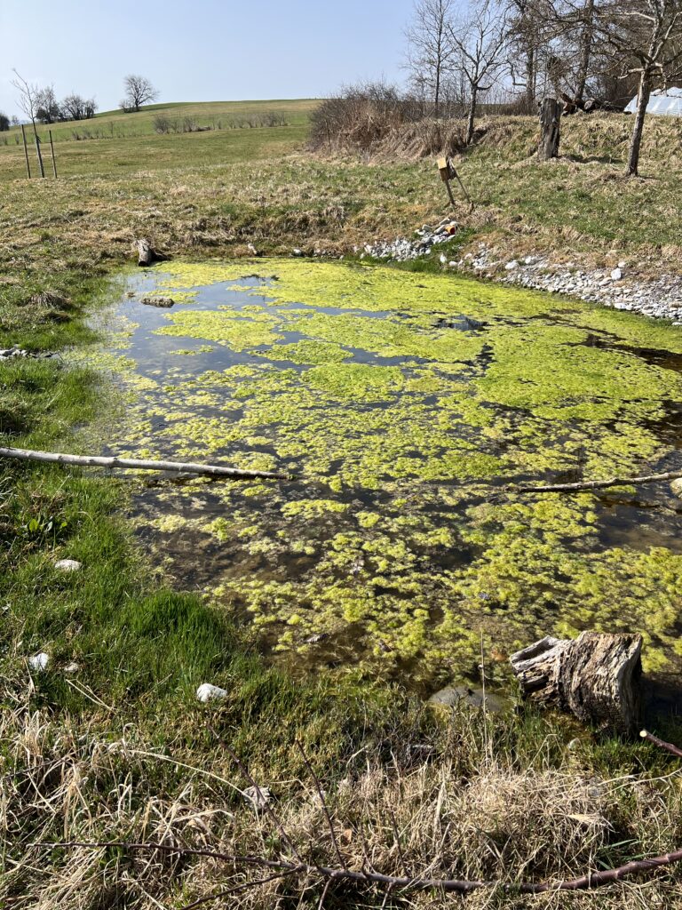Les algues ou mousses gluantes sont là aussi aussi. C’est d’ailleurs un peu rageant. Les enlever au râteau est utile, mais l’effet dure très peu de temps. Tous les étages sont « infestés »: swale – baissière du haut, puis Bienne, Neuchâtel et Morat. On ne sait pas si la biodiversité reprenant ses droits, ces mousses risquent d’enfin disparaître. Nous veillons tout de même, d’entente avec ProNatura et les conseils de NaturaConsultus, de ne pas laisser les massettes reprendre le dessus. À suivre, sinon il faudra peut-être envisager d’autres stratégies, planter des hélophytes peut-être? Mais l’idée de base était d’abord de laisser faire (sauf pour les massettes).